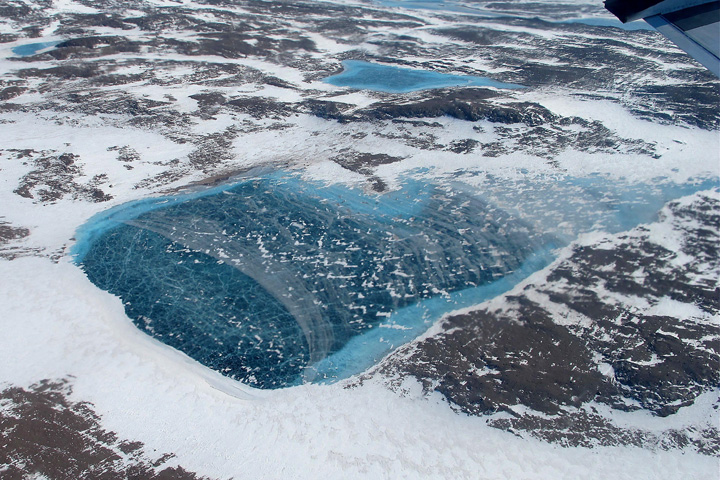 Researchers spied this pond during a flight designed to examine the bedrock topography of northeast Greenland, as well as the movement of ice into the ocean. During NASA’s multi-year IceBridge airborne campaign, scientists are flying novel instruments to measure the surface of the ice sheet, the solid ground below it, and how the two are interacting. Data from the airborne campaigns are intended to mirror similar observations made by the ICESat satellite mission (2003–2010) and the upcoming ICESat-II (planned for launch in 2016).