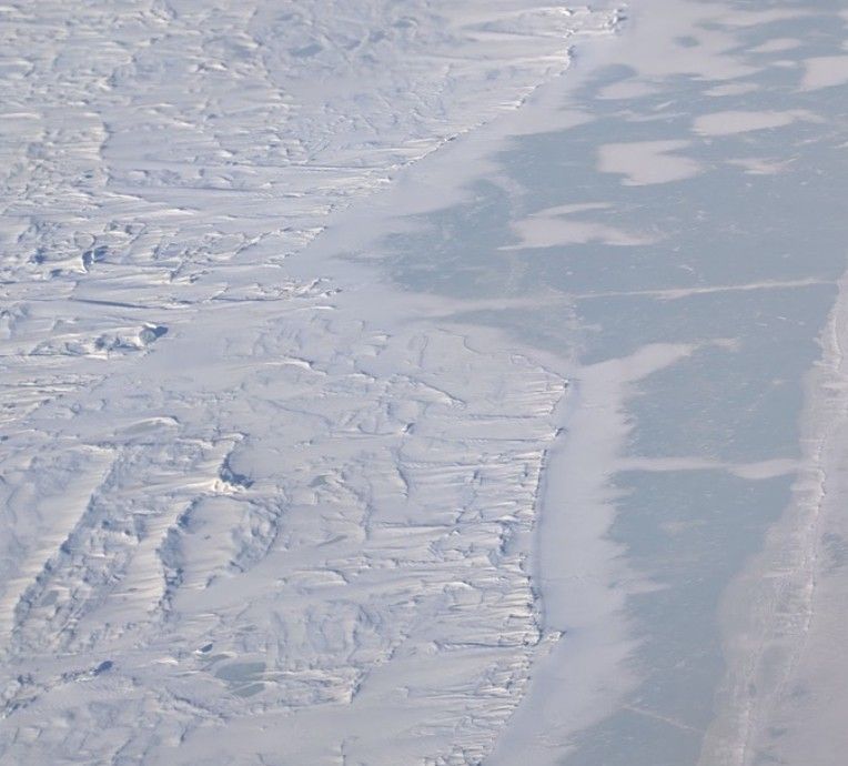 These photographs were snapped during research flights for NASA’s Operation IceBridge—now in its final year after a decade of airborne missions to map polar ice. The first photograph, shot by Jeremy Harbeck on April 16, 2019, shows part of a frozen meltwater lake in the Lambert Land region of northeastern Greenland, between the Zachariæ Isstrøm and 79N glaciers.