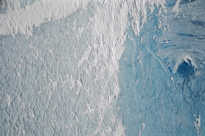 The third photo shows a refrozen melt pond with more muted color. Jim Yungel, an engineer based at NASA’s Wallops Flight Facility, was flying with the IceBridge mission on April 17, 2019, when he shot the image over Petermann Glacier in northwestern Greenland. The pond, which was likely liquid during the previous melt season, now appears to be well frozen and covered with snow. Winds have cleared away some snow, exposing part of the frozen surface.