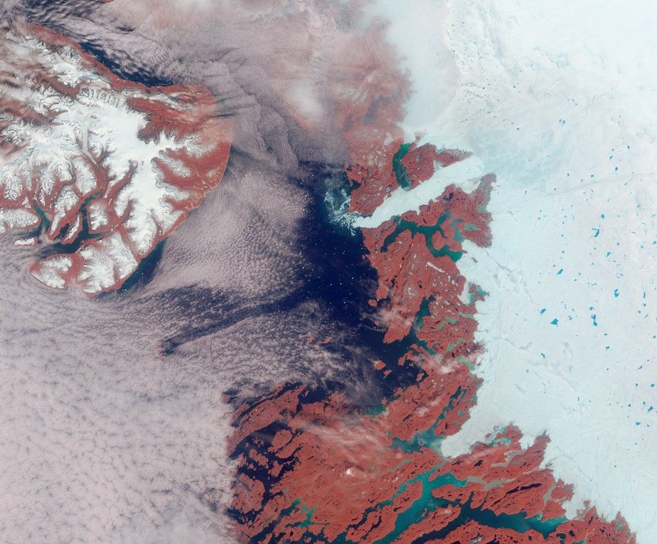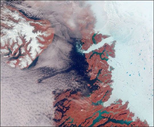 Vibrant reds, emerald greens, brilliant whites, and pastel blues adornthis view of the area surrounding the Jakobshavn Glacier on the westerncoast of Greenland. The image is a false-color (near-infrared, green,blue) view acquired by the Multi-angle Imaging SpectroRadiometer’s nadircamera. The brightness of vegetation in the near-infrared contributes tothe reddish hues; glacial silt gives rise to the green color of thewater; and blue-colored melt ponds are visible in the bright white ice.A scattering of small icebergs in Disco Bay adds a touch of glitterysparkle to the scene.