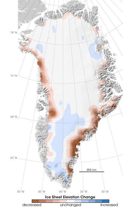Several field studies confirmed these predictions. Bill Krabill, a geoscientist at NASA’s Wallops Flight Facility, measured an inland gain of up to 1 meter of snow and up to three times average snowfall in some areas of Southeast Greenland between 2002 and 2003. In 2005, Ola Johannessen, from the University of Bergen’s Nansen Environmental and Remote Sensing Center, measured a gain of 2.4 inches per year from 1992 to 2003 for elevations above 1,500 meters, with a net ice loss below that elevation. But even if the models were right, which trend—ice gain in the interior, or melting at the margin—would prove greater, and by how much?