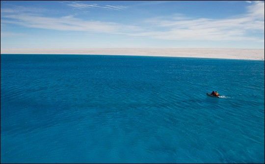 On-the-ice research in Greenland is generally limited to the short period after the worst of winter’s cold and before summer’s melt can make the ice treacherous. According to Abdalati, an ominous sound mingling with the wind ushers in each summer: gurgling water. Melt water begins to flow under the snow that blankets the ice, enlarging small cracks and fissures under the frozen skin, sometimes trickling and sometimes plunging toward the bottom of the ice sheet. For the first few weeks, the melt water sounds like a peaceful stream. Soon it takes on the menacing roar of a rushing river.