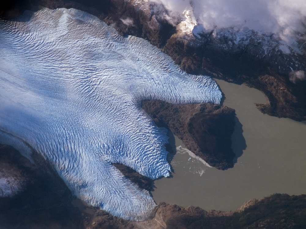 The astronaut photograph, acquired in 2007, is compared with a false-color image from the Landsat 5 satellite captured in 1986. The false-color image highlights glacier ice in bright blue (lower image). Vegetation is bright green, and bare ground is pink. The general position of the glacier’s terminus in 2007 is marked with yellow lines on the 1986 image. All three lobes have retreated over the 22-year period, with the greatest loss of ice occurring along the westernmost lobe terminus. Grey Glacier, like others in southern Patagonia, loses ice from its terminus as it enters the water, a process known as calving. Calving produces large free-floating chunks of ice; some floating ice is visible near the central glacier lobe in the upper image. The observed retreat means that ice loss has been greater than ice replenishment. It is most likely due to a combination of increased regional temperatures and changes in precipitation amounts.