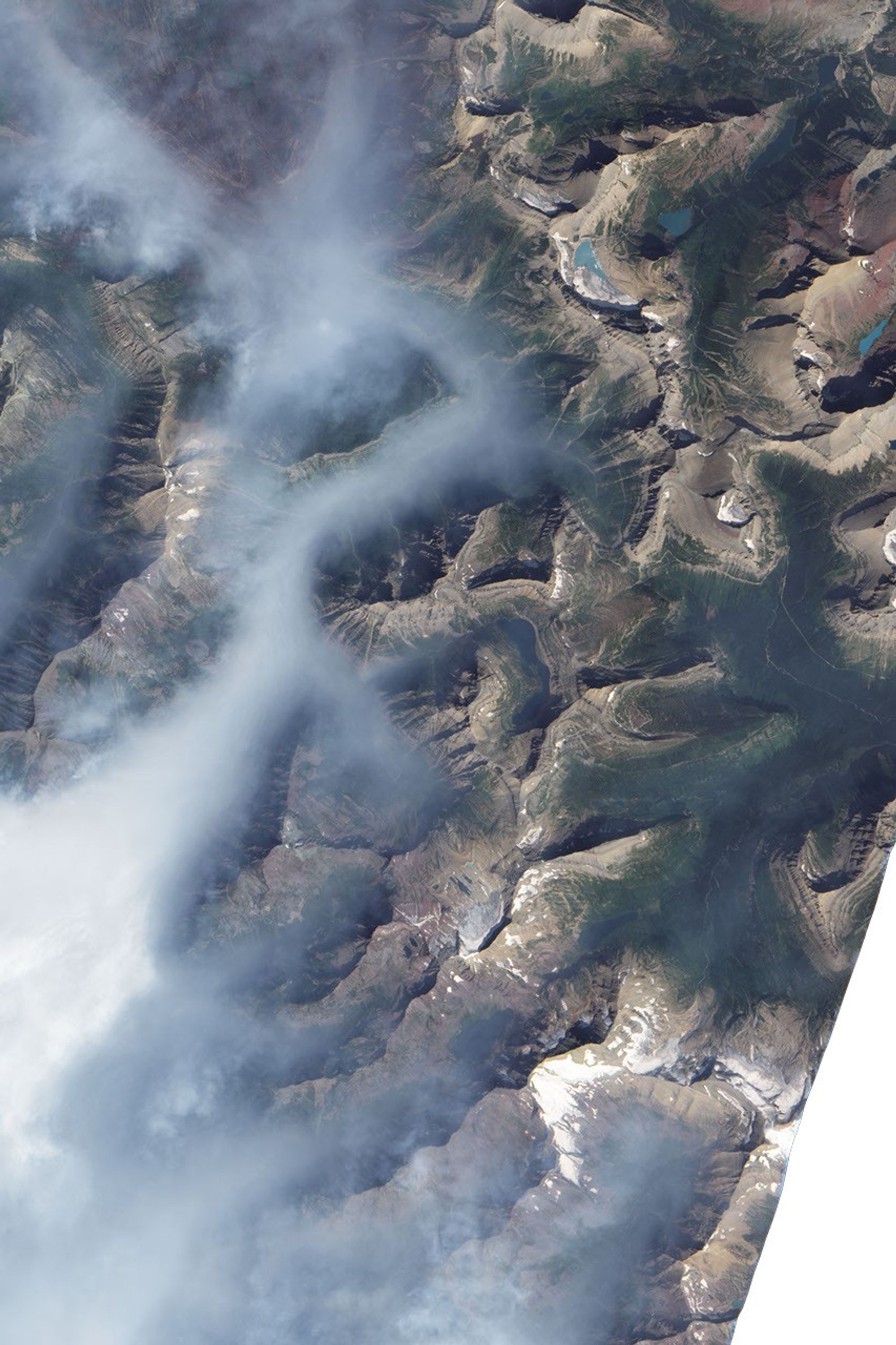 This image of Grinnell Glacier, in the heart of the park, was captured by the Advanced Land Imager on NASA’s Earth Observing-1 (EO-1) satellite on August 21, 2003. Yellow outlines trace the extent of the Grinnell and nearby glaciers in 1950. (Glacier extents have been digitized from paper maps made by the U.S. Geological Survey as part of the GLIMS project.) Lower slopes of mountains are blanketed in forest, while above treeline, the ground appears to be bare rock. Small alpine plants may be present, but if so, they are too small or too widely scattered to detect.
