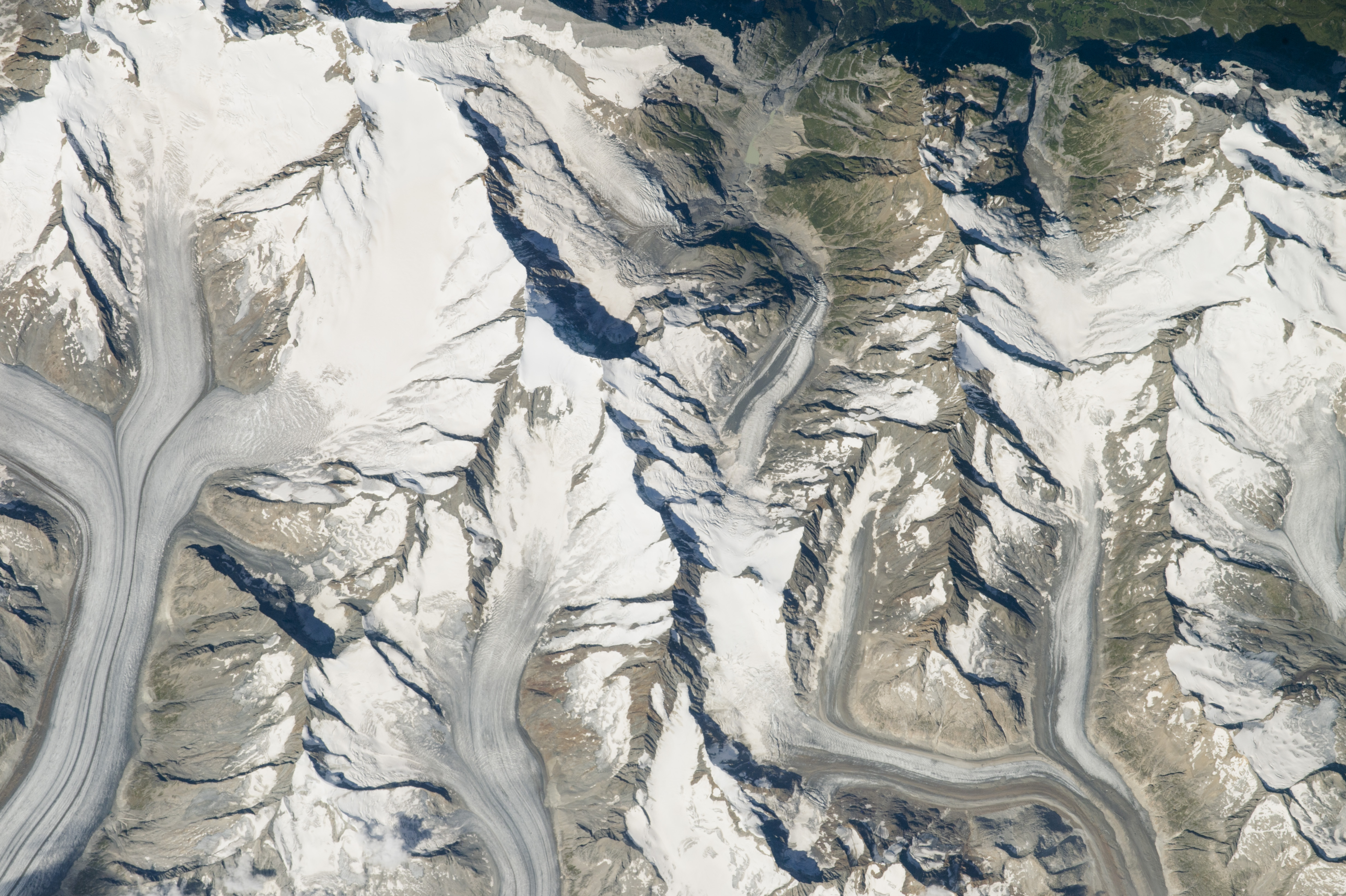 An astronaut aboard the International Space Station took this photograph of the highest mountain in the Swiss Alps and the center of western Eurasia’s largest glaciated area. This is the Jungfrau-Aletsch protected area. These peaks feature huge glaciers, with bright snowy slopes that contrast with dark shadows on other steep slopes.