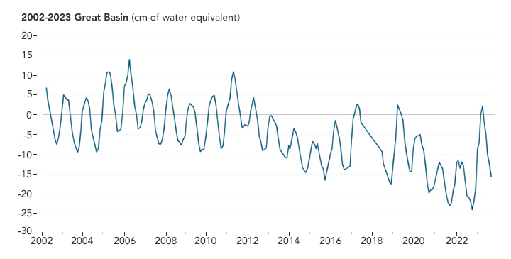 Declining water levels in the Great Salt Lake and Lake Mead have been testaments to a megadrought afflicting western North America since 2000. But surface water only accounts for a fraction of the Great Basin watershed, which covers most of Nevada and large portions of California, Utah, and Oregon. Far more of the region’s water is underground. That has historically made it difficult to track the impact of droughts on the overall water content of the Great Basin.