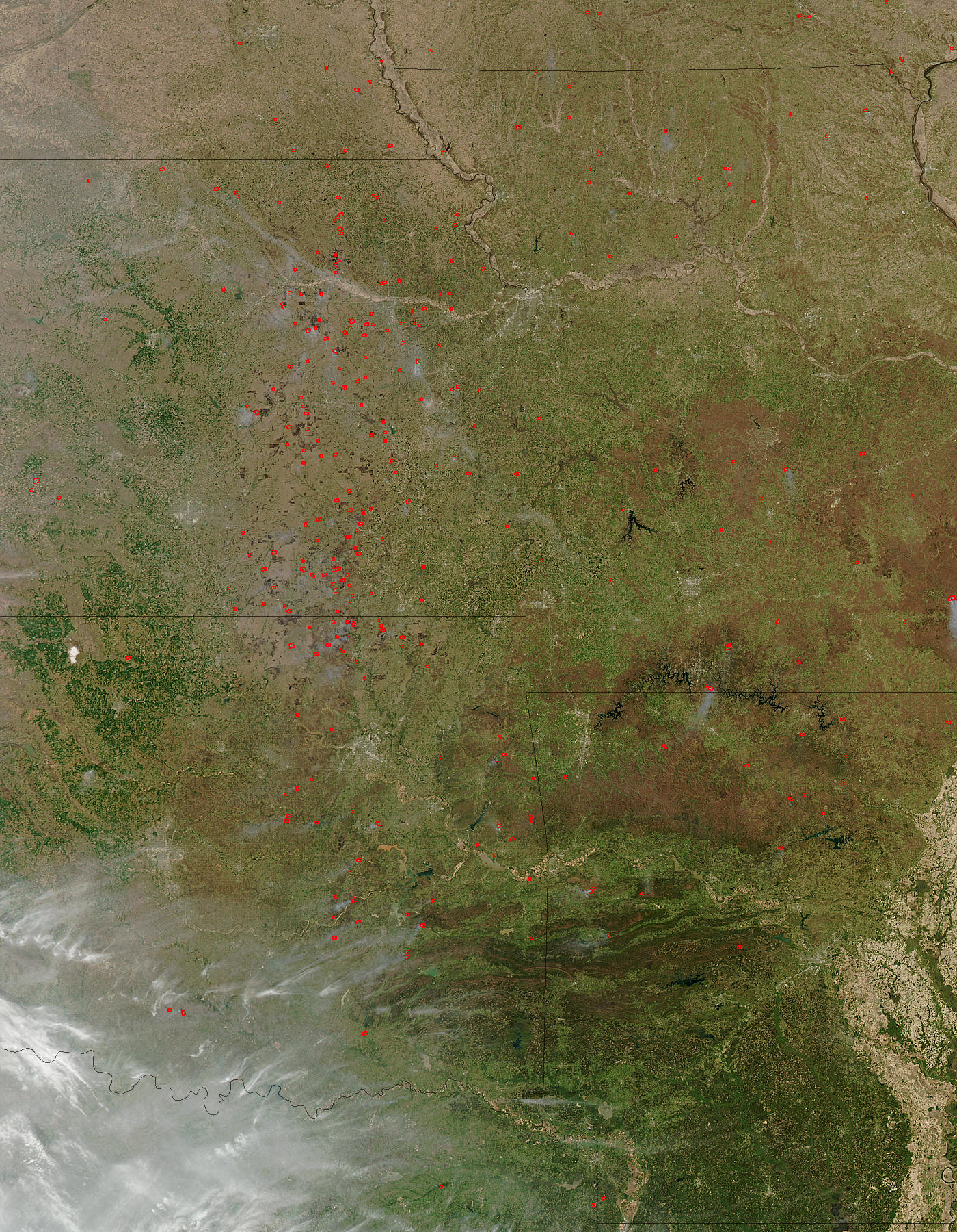Agricultural burning continues across the Central Plains of the United States on April 4, 2004. The fires, detected by the Moderate Resolution Imaging Spectroradiometer (MODIS) on the Aqua satellite have been marked with red dots in this image. The fires are concentrated in Kansas and Oklahoma (top left and bottom left), with additional fires in Missouri and Arkansas (top right and bottom right).