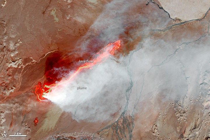 The Operational Land Imager (OLI) on Landsat 8 captured this view of the lava field on January 3, 2015. The false-color images combine shortwave infrared, near infrared, and red light (OLI bands 6-5-4). The plume of steam and sulfur dioxide appears white. Newly-formed basaltic rock is black. Fresh lava is bright orange. A lava lake is visible on the western part of the lava field, and steam rises from the eastern margin where the lava meets the Jökulsá á Fjöllum river.