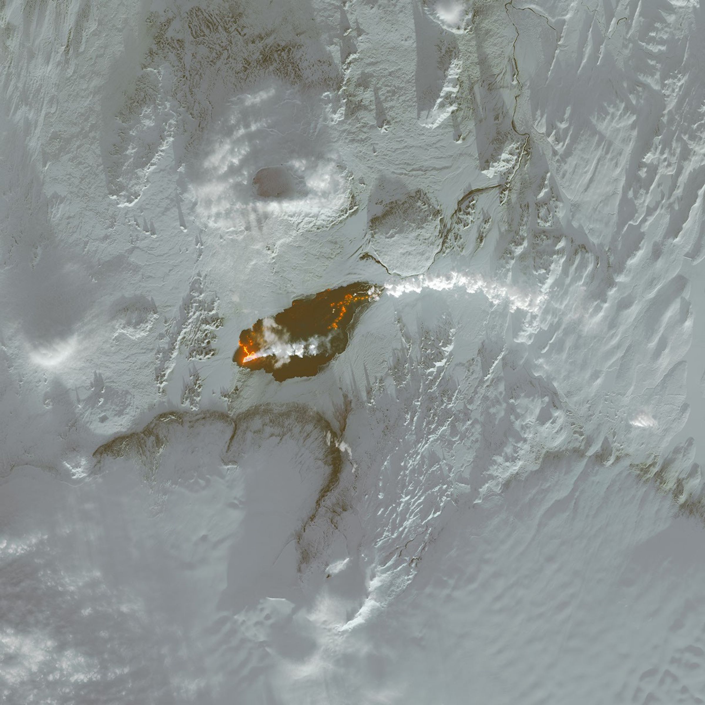 The Operational Land Imager (OLI) on Landsat 8 captured this view of the lava field on January 3, 2015. The false-color images combine shortwave infrared, near infrared, and red light (OLI bands 6-5-4). The plume of steam and sulfur dioxide appears white. Newly-formed basaltic rock is black. Fresh lava is bright orange. A lava lake is visible on the western part of the lava field, and steam rises from the eastern margin where the lava meets the Jökulsá á Fjöllum river.