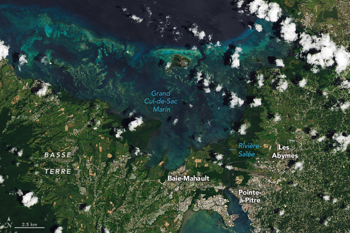The Rivière Salée (salt river) separates Basse-Terre and Grande-Terre, as well as the towns of Baie-Mahault (mangrove bay) and Pointe-à -Pitre. The large, shallow marine lagoon, Grand Cul-de-Sac Marin, is home to the longest coral reef in the Lesser Antilles, as well as mudflats, seagrass beds, and mangrove forests. The freshwater swamps and marshes around the lagoon provide abundant habitat for nesting and breeding birds including pelicans, terns, and gulls.