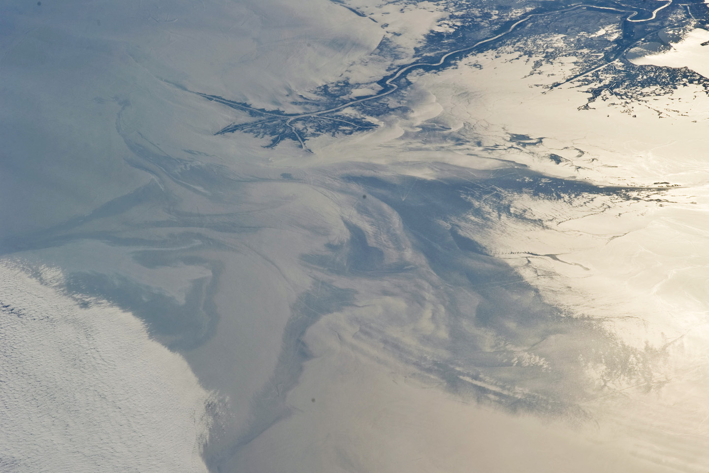 The Mississippi River Delta and nearby Louisiana coast (image top) appear dark in the sunglint that illuminates most of the image. Sunglint is caused by sunlight reflecting off the water surface—much like a mirror—directly back towards the astronaut observer on the Space Station. The sunglint improves the identification of the oil spill. Oil on the water smoothes the surface texture, and the mirror-like reflection of the Sun accentuates the difference between the smooth, oil-covered water (dark to light gray ) and the rougher water of the reflective ocean surface (colored silver to white). Wind and water currents patterns have modified the oil spill’s original shape into streamers and elongated masses. Among the coastal ecosystems threatened by the spill are the Chandeleur Islands (image right center).