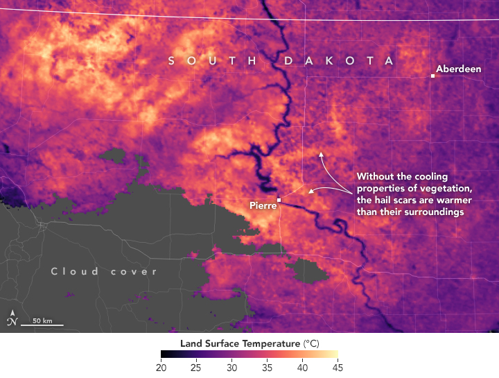 “Crops and grasslands can present a very uniform and green background when observed from space. With wind-driven hail capable of shredding the vegetation, the storm damage becomes visible in satellite imagery,” explained Bell. Following a similar event in South Dakota in 2003, researchers noted that the hail scar remained visible in satellite imagery for about six weeks.