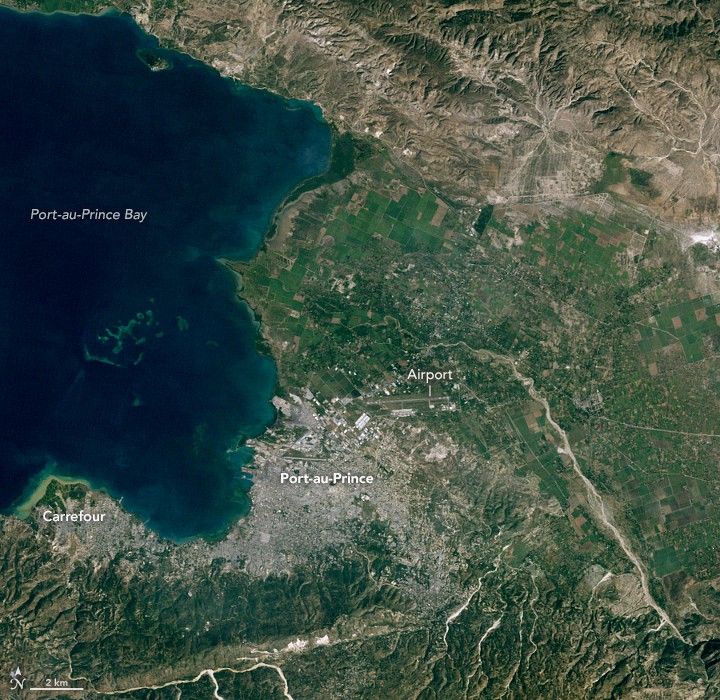 After the earthquake, more than a million displaced Haitians crowded into makeshift tent cities on golf courses, parks, and other open spaces around Port-Au-Prince. On March 22, 2010, with the wet season bringing flooding and infectious diseases spreading, Haiti’s president declared 50 square kilometers (20 square miles) of open land northeast of the capital city to be public. At the same time, non-governmental aid organizations rushed to establish camps for displaced people in this new land.