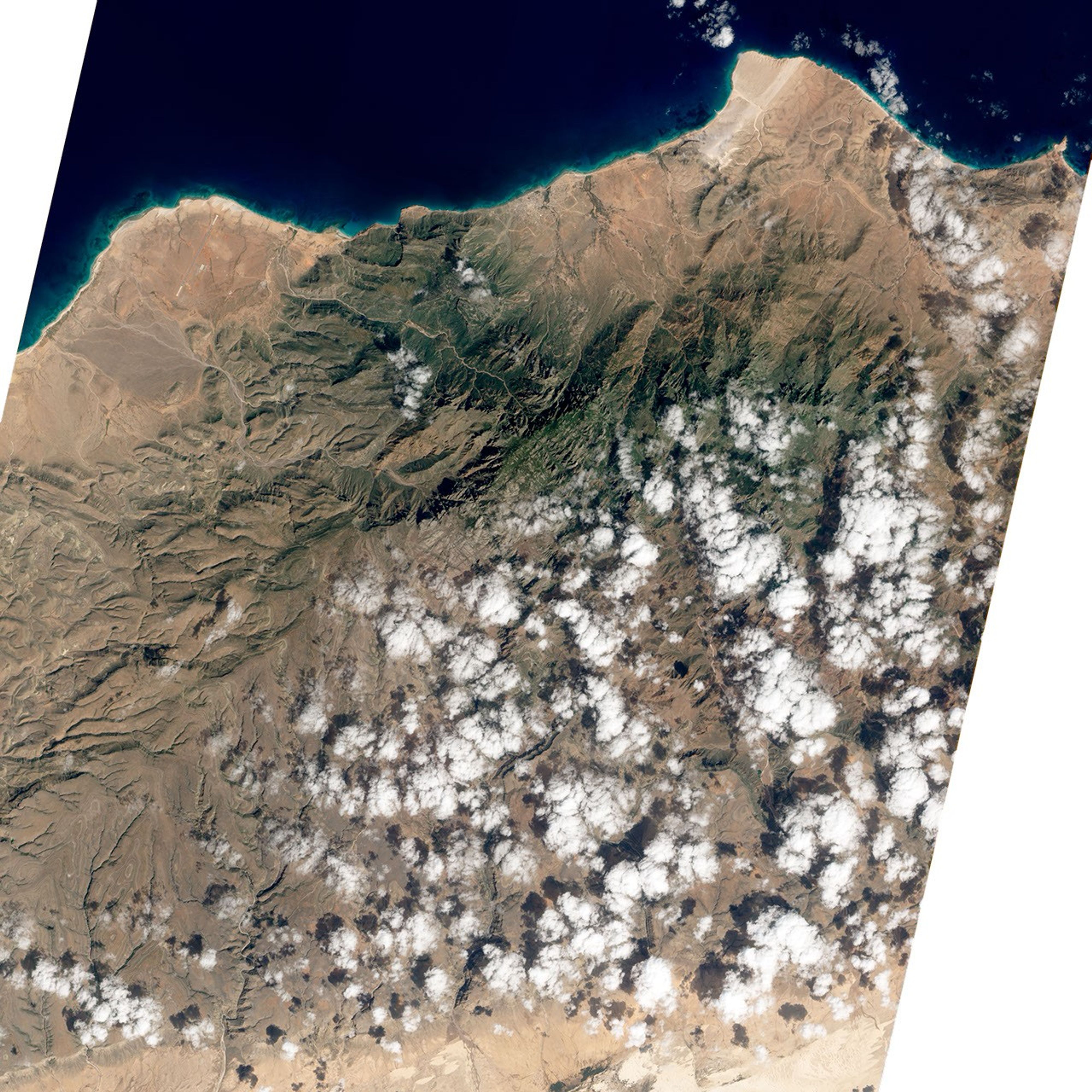 Clouds cast their shadows on the slopes of the Hajhir (or Haggeher) Mountains of Socotra on January 29, 2003. The Advanced Land Imager (ALI) on NASA’s Earth Observing-1 (EO-1) satellite captured this natural-color image the same day. Clouds and mists provide the principal source of moisture for Socotra’s most biologically diverse spot.