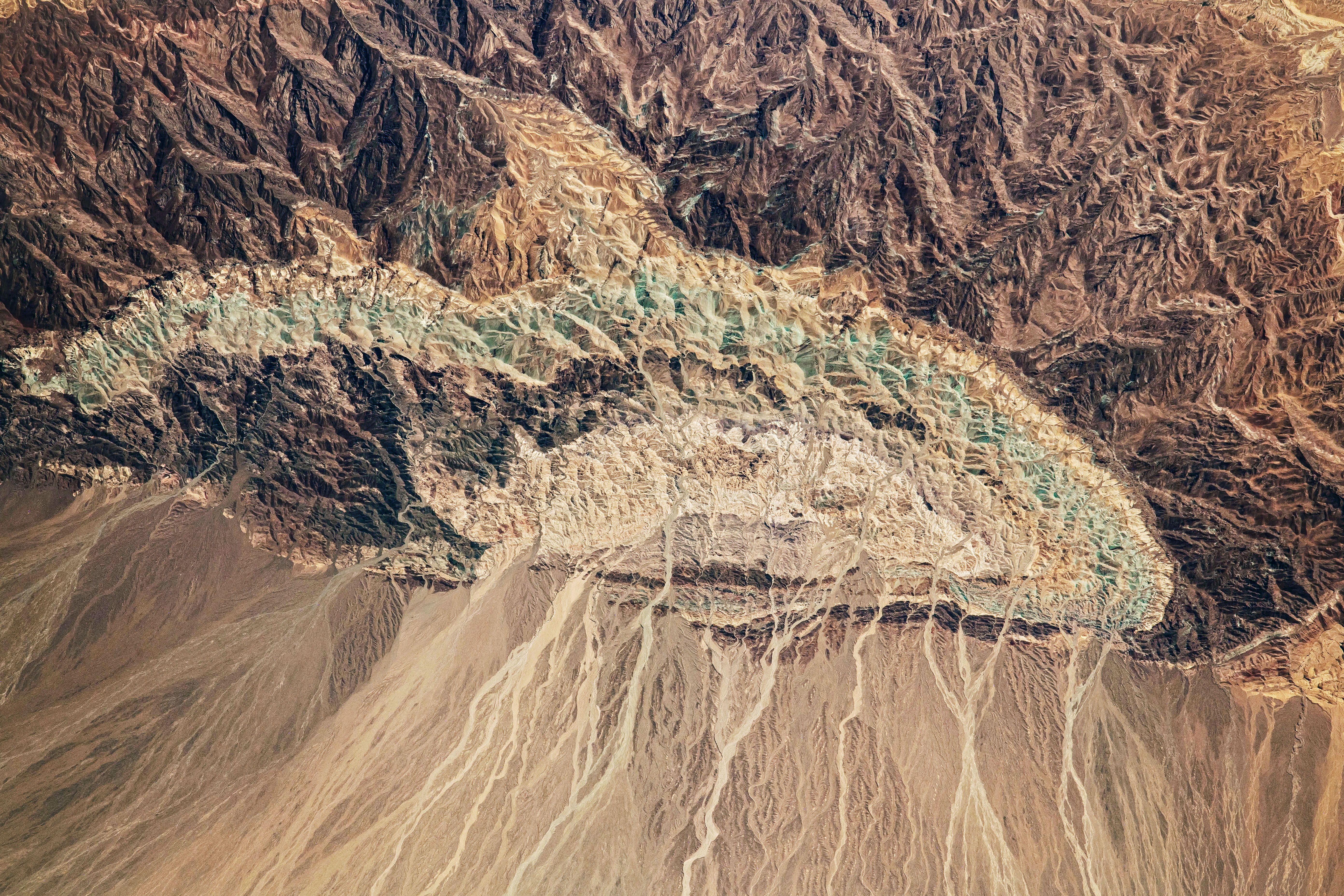 The fan surfaces stand nearly 900 meters (2,900 feet) lower than the summit of the hills. Most of the streams flow from the hills toward the fans, where they deposit sediment eroded from the hills. The color of alluvial fan sediments often reflects the color of the parent rocks upstream. For instance, sediment eroded from the darker rocks of the mountain (center left) gives the accompanying fans a darker color. Similarly, light-toned sediment from rocks in the middle of the mountain gives some fans a lighter tone. In this desert region, the streams end in the (typically dry) Lake Namak, just outside the lower margin of the photo.