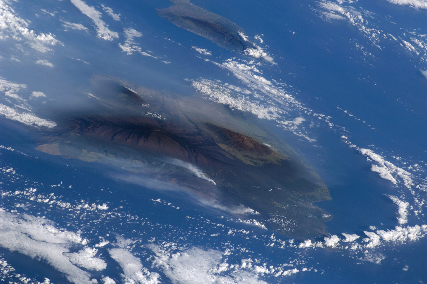 Kilauea Volcano, on the island of Hawaii, has been erupting continuously since 1983. This image, taken by the crew of Space Shuttle Atlantis (after completing the capture of the Hubble Space Telescope), shows volcanic plumes from Kilauea rising up from three locations: Halema‘uma‘u Crater, Pu‘u ‘O‘o Crater, and from along the coastline where lava flows from the East Rift zone were entering the ocean. The plumes have created a blanket of volcanic fog, called vog, that envelops the island.