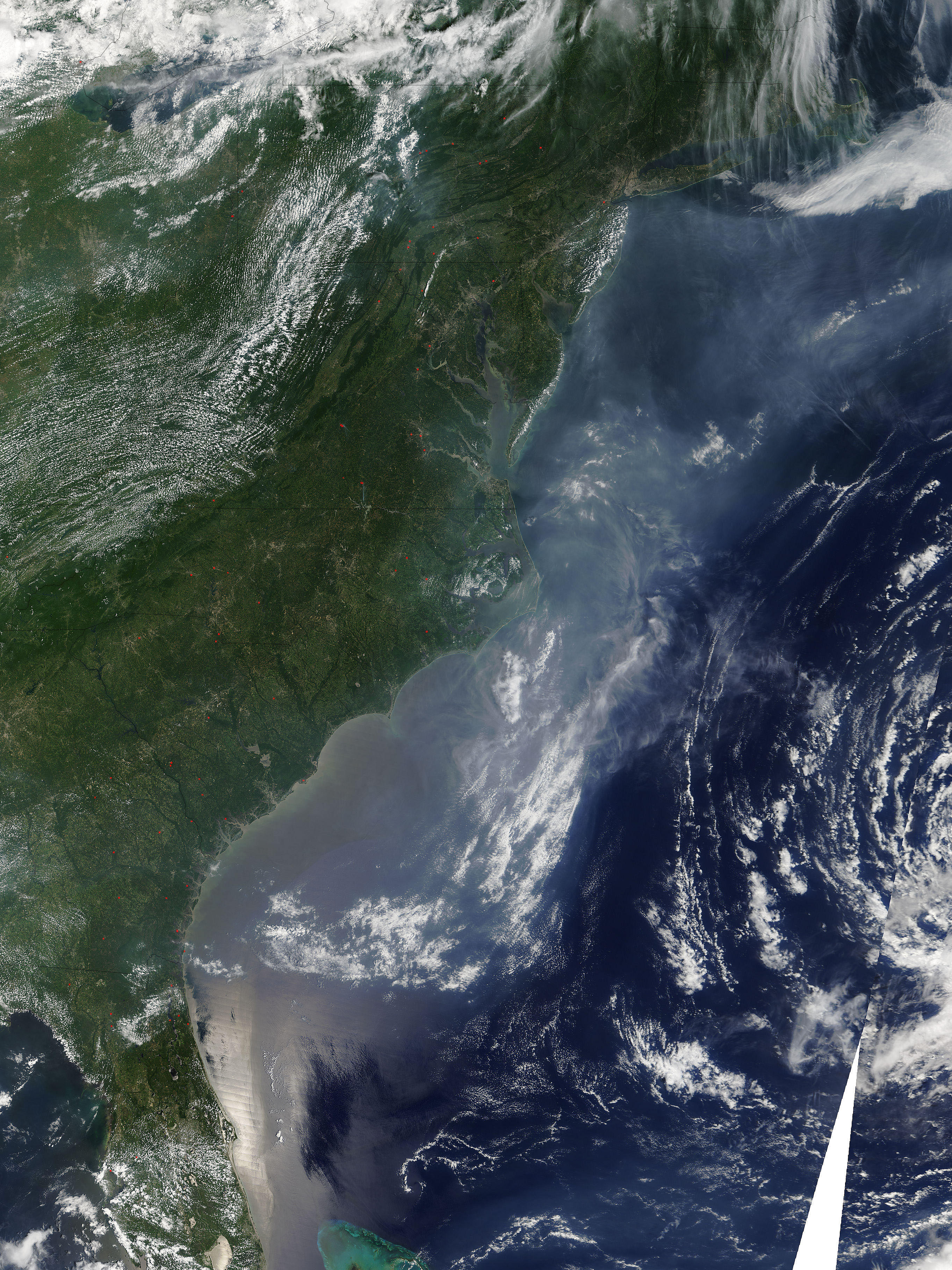 This image of the Eastern United States was captured on July 26, 2005, by the Moderate Resolution Imaging Spectroradiometer (MODIS) on NASA’s Terra satellite. Hazy air from along the eastern seaboard from Pennsylvania to Georgia was lingering over coastal regions and spreading out over the Atlantic Ocean. Numerous fires were detected by MODIS and have been marked with red dots.