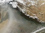 Haze continued to hover over northern India and Pakistan in mid-November 2008. The Moderate Resolution Imaging Spectroradiometer (MODIS) on NASA’s Aqua satellite took this picture on November 16, 2008. In this image, gray-beige haze hugs the southwestern face of the Himalaya, and in some areas, the haze appears to infiltrate the low-lying mountain valleys. To the south, an especially thick plume of haze forms an arc along the border between Pakistan and India.