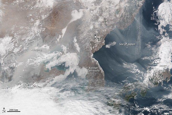 The haze limited visibility from space, too. The Visible Infrared Imaging Radiometer Suite (VIIRS) instrument on the Suomi NPP satellite captured the development of the pollution event and its transport across eastern Asia. The top image shows February 20, when the haze was confined to the North China Plain. The lower image offers a view from February 25, when the haze had thickened over China and extended north and east over Korea, the Sea of Japan, and Japan.