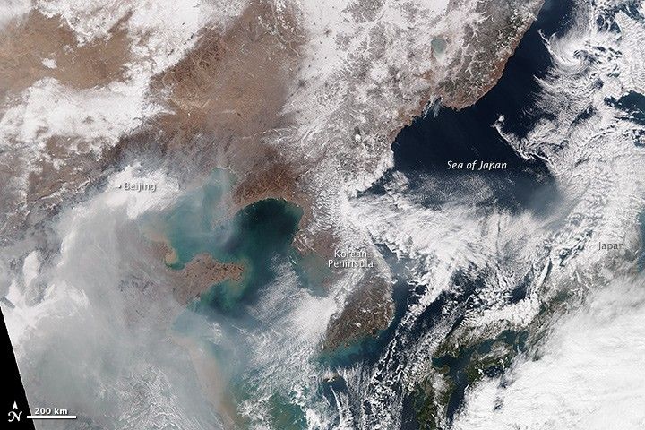 The haze limited visibility from space, too. The Visible Infrared Imaging Radiometer Suite (VIIRS) instrument on the Suomi NPP satellite captured the development of the pollution event and its transport across eastern Asia. The top image shows February 20, when the haze was confined to the North China Plain. The lower image offers a view from February 25, when the haze had thickened over China and extended north and east over Korea, the Sea of Japan, and Japan.