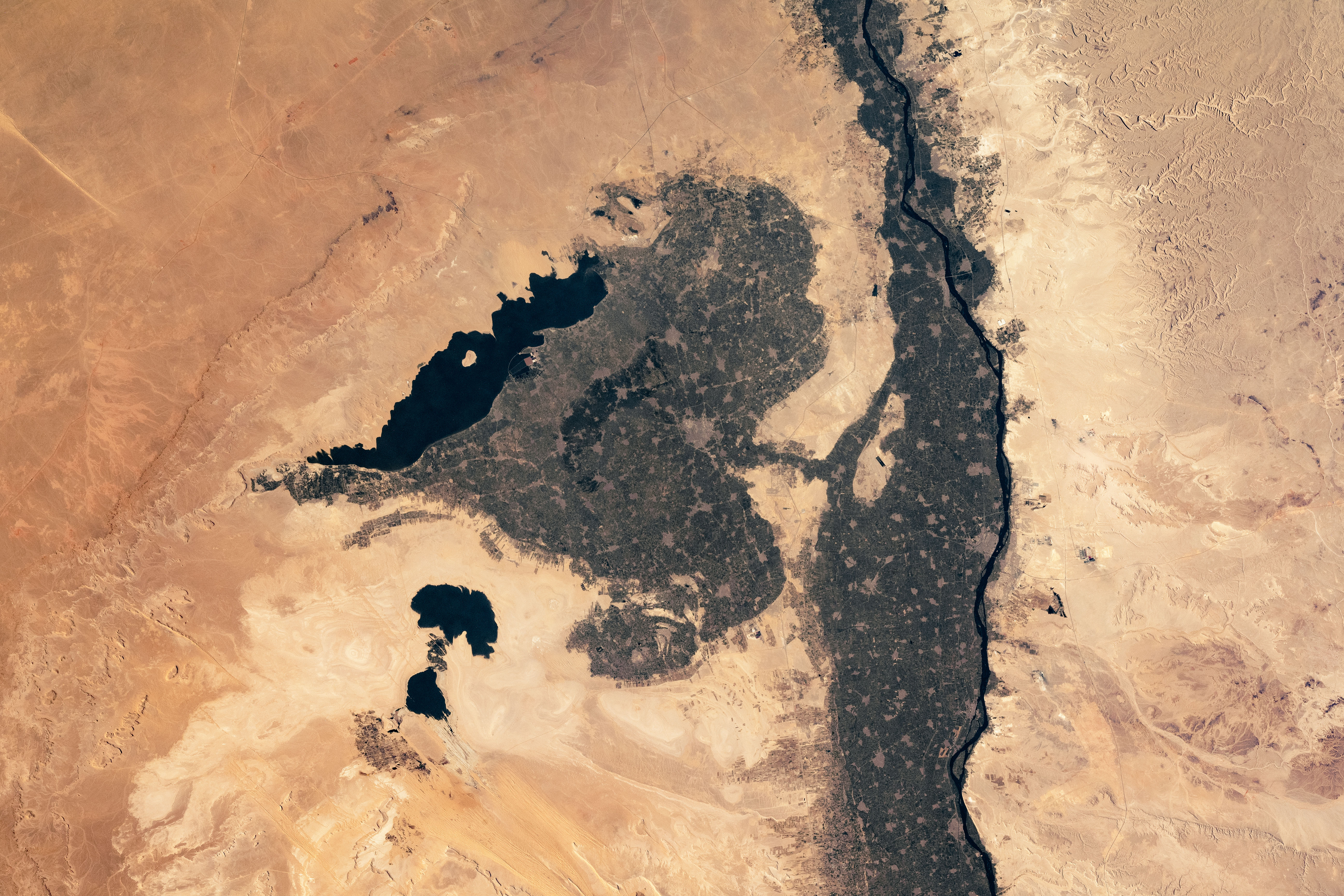 While in orbit over Egypt, an astronaut on the International Space Station (ISS) captured a photograph of this heart-shaped basin bordering the Nile River and the Western Desert. The depression, known as the Faiyum Oasis, spreads across more than 1,200 square kilometers (450 square miles) and was formed from the ancient lakebed of Lake Moeris.