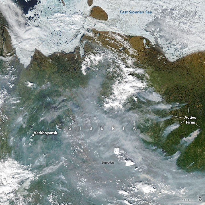 The persistent high-pressure atmospheric pattern that brought the extreme heat has exacerbated wildfires, prompting dozens to burn in the region’s forest and shrub ecosystems. Some of those ecosystems grow on top of carbon-rich layers of peat and permafrost. The natural-color image below shows smoke streaming from several active wildfires in Russia's Sakha region.