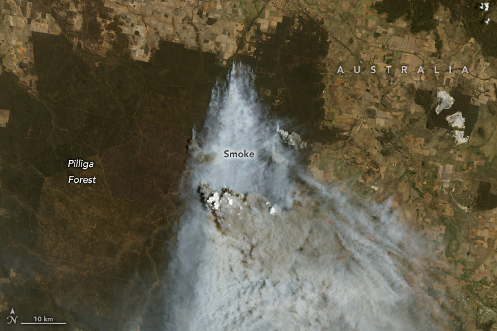 The hot, dry conditions heightened the risk of bushfires in Western Australia, Northern Territory, and New South Wales. Near Narrabri, New South Wales (360 kilometers northwest of Sydney), a fire broke out in Pilliga Forest and quickly spread to cover 121,000 hectares (300,000 acres) by December 18. Smoke can be seen billowing from the fire in the image above, acquired by the OLI (Operational Land Imager) on Landsat 8 on December 17. Smoke drifted east from the fires and filled the skies in Sydney, causing poor air quality, according to news reports.
