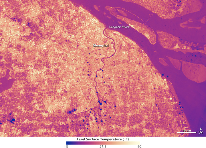 Though miserable everywhere, the heat wave was likely worst in China’s cities, where manmade surfaces absorb heat during the day and cool slowly at night. As a result, cities are warmer during the day and slower to cool at night, making an extended heat wave more uncomfortable, and more deadly, in a city. The image below shows this “urban heat island” effect in Shanghai.