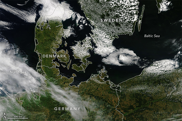 The images above show browning in north-central Europe on July 24, 2018. For comparison, the second image shows the same area one year ago. Both images were acquired by the Moderate Resolution Imaging Spectroradiometer (MODIS) on NASA’s Terra satellite.