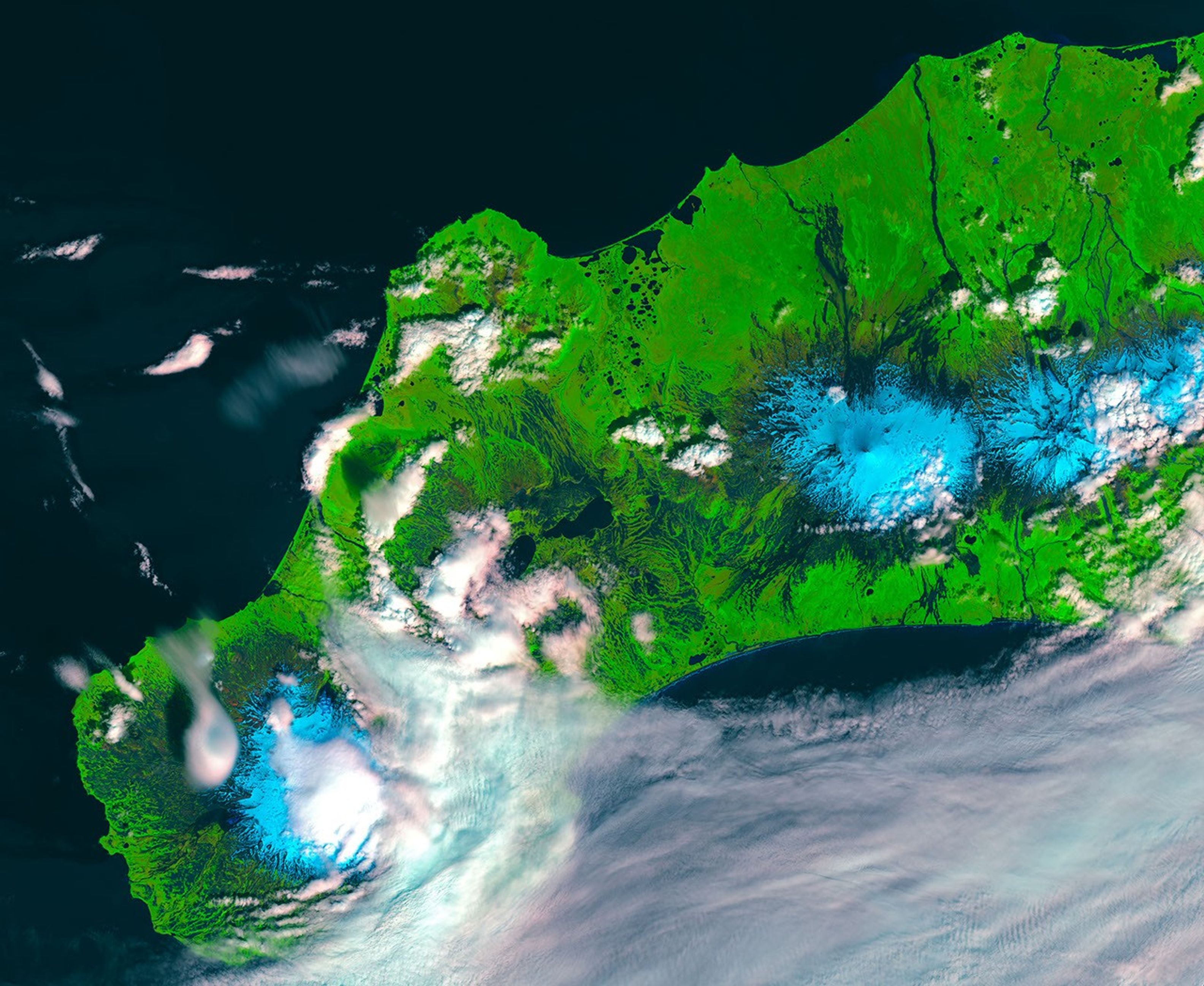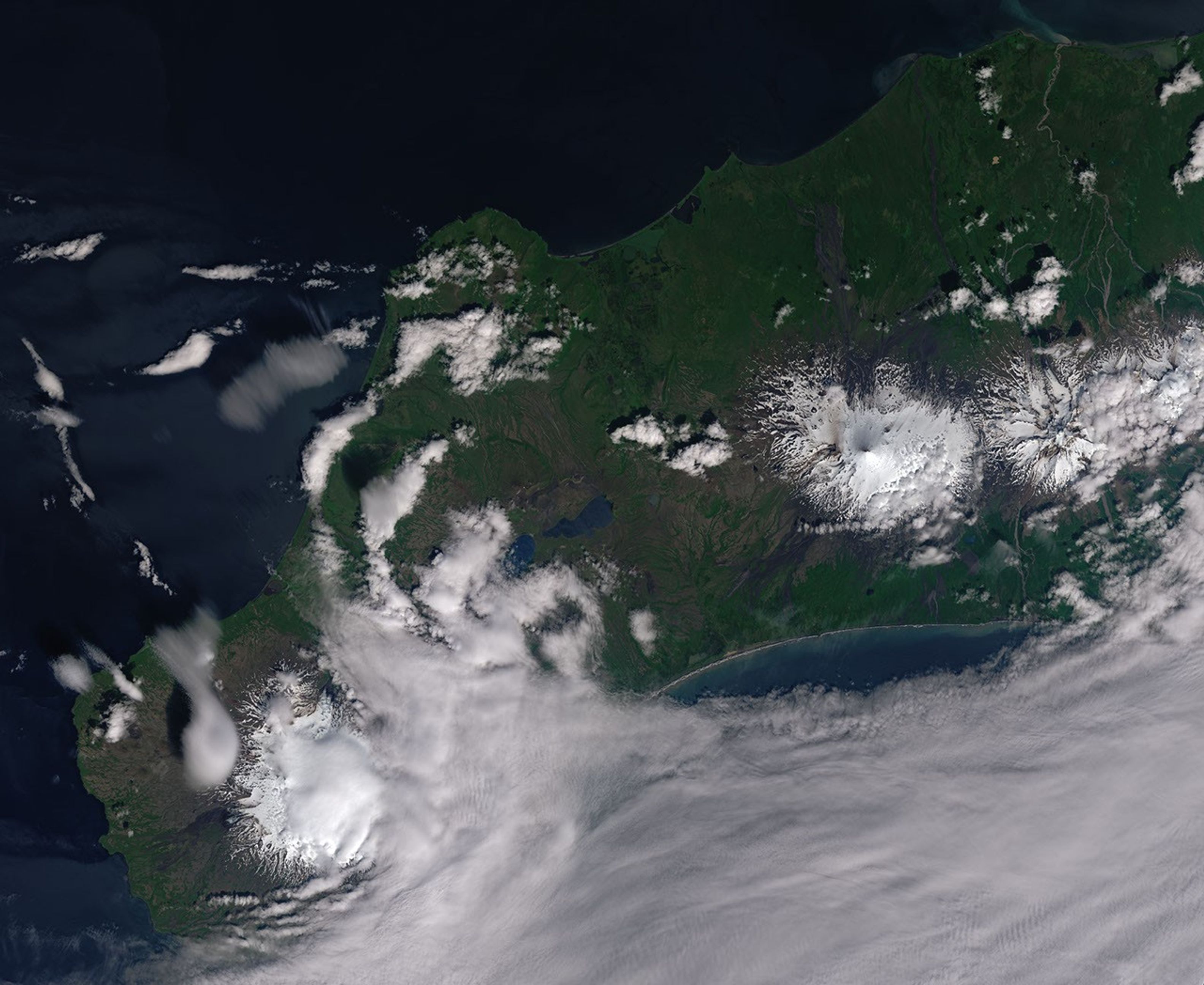 Unimak Island in Alaska is the largest and easternmost of the Aleutian Islands, and it is home to three glacier-covered stratovolcanoes. Two are dormant, but the third, cone-shaped Mount Shishaldin, emits a steady plume of steam from its summit crater. Occasionally minor blasts—volocanologists call them Strombolian eruptions—fling chunks of pasty lava into the air and unleash surface lava flows within the crater.