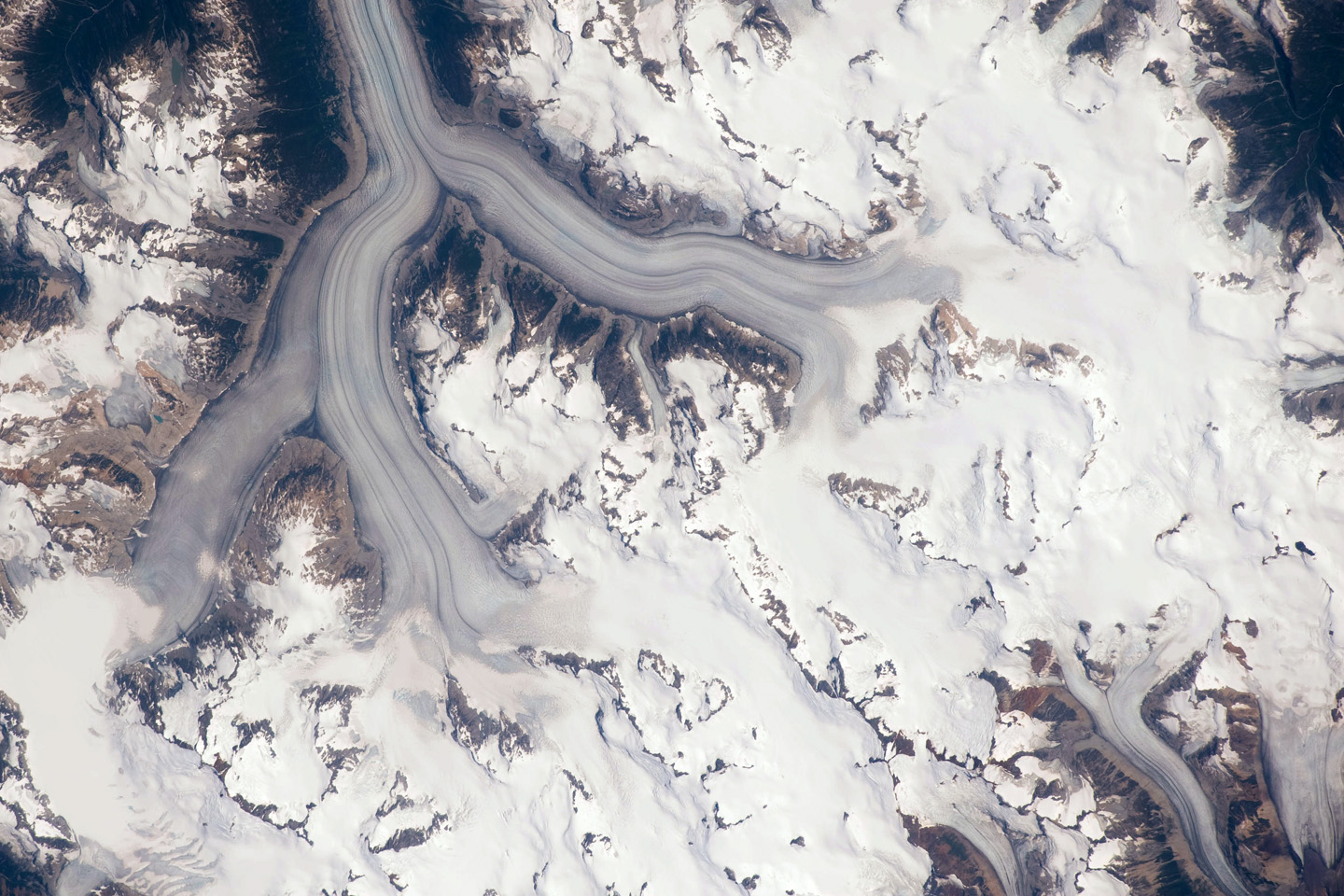 The Heiltskuk (also written Ha-Iltzuk) Icefield covers an area of approximately 3,600 square kilometers (1,389 square miles) in the southern Coast Mountains of British Columbia. This detailed astronaut photograph illustrates the icefield—mostly covered by snow across the upper mountain slopes—and two major valley glaciers that extend from it. Valley glaciers are large masses of slowly flowing ice and entrained debris that move downhill, carving out wide U-shaped valleys in the process. The locations of former valley glaciers can frequently be identified by the presence of these U-shaped valleys on a now glacier-free landscape.