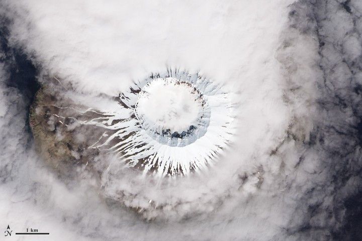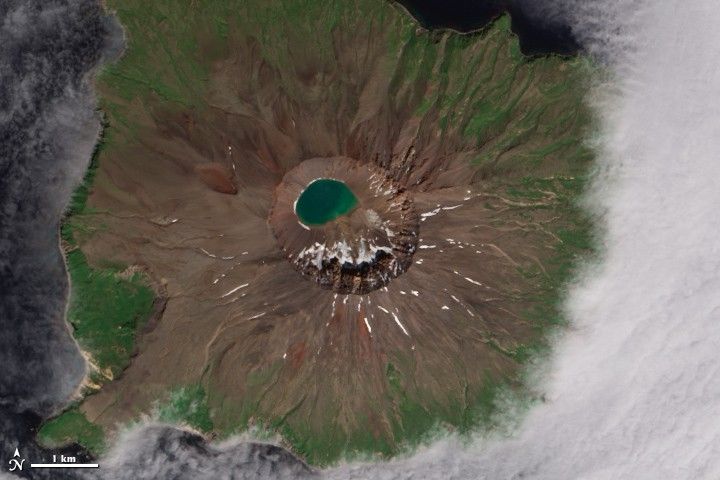 The remote volcanic island has scarcely been studied, and there are no records of eruptions there. Geologists have been much more interested in Cleveland volcano, which sits just 5 kilometers (3 miles) to the east on Chuginadak Island. Cleveland is one of the most active volcanoes in the Aleutians. Scientists at the Alaska Volcano Observatory keep track of all of the volcanoes in the Aleutians because ash eruptions can create hazards for airplanes that pass through the area on their way from North America to Asia and Europe.