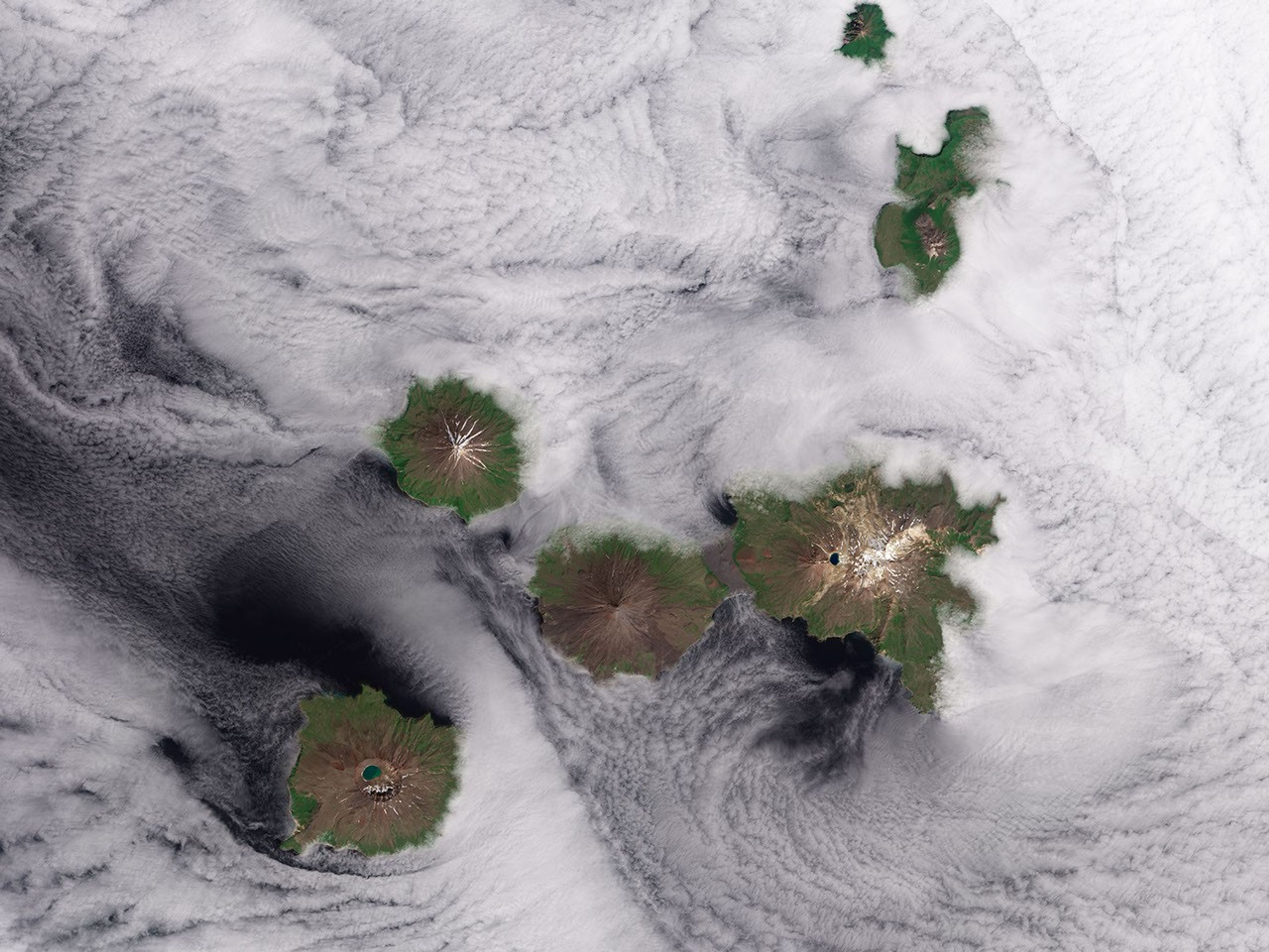 On June 8, 2013 (top), the summit and caldera are coated with snow and ice, while lower elevations appear to be clear. Clouds obscure most of the slopes and lowlands, with thicker cover on the north side of the island. If you download the larger image, you will see that the pattern repeats at other nearby islands, suggesting that winds were out of the south and the volcanic islands were affecting the formation of clouds.
