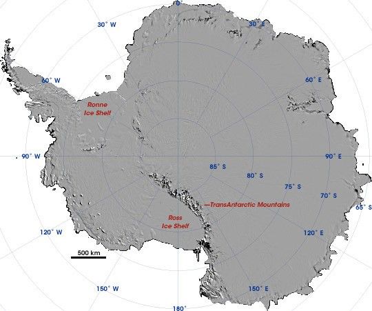 Like liquid water, glaciers and ice sheets flow downhill under the influence of gravity. On Antarctica, the average elevation is 2,300 meters (7, 544 feet) above sea level, and glaciers flow seaward from these heights, extending into the Southern Ocean as floating ice shelves. The two largest are the Ross Ice Shelf and the Ronne Ice Shelf. Both these ice shelves occur west of the Transantarctic Mountains, which divide the continent into two geographic regions: East and West Antarctica. Many smaller ice shelves fringe the coastline of East Antarctica.