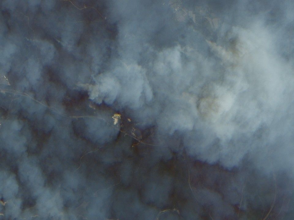 Smoke obscures much of the landscape near Sydney, Australia, in the true-color image above (top). However, the areas with active fires are revealed by the false-color image (bottom), which was made using shortwave infrared data that are sensitive to heat and provide the ability to “see” through smoke. In the bottom scene, the black areas show fresh burn scars, while greens show landscape untouched by fire. Apparently, the fire burned up to the edge of a road (the thin black line snaking from the lefthand side of the image and disappearing off the bottom) and was unable to jump across. The thick dark line along the bottom of the scene is a river.