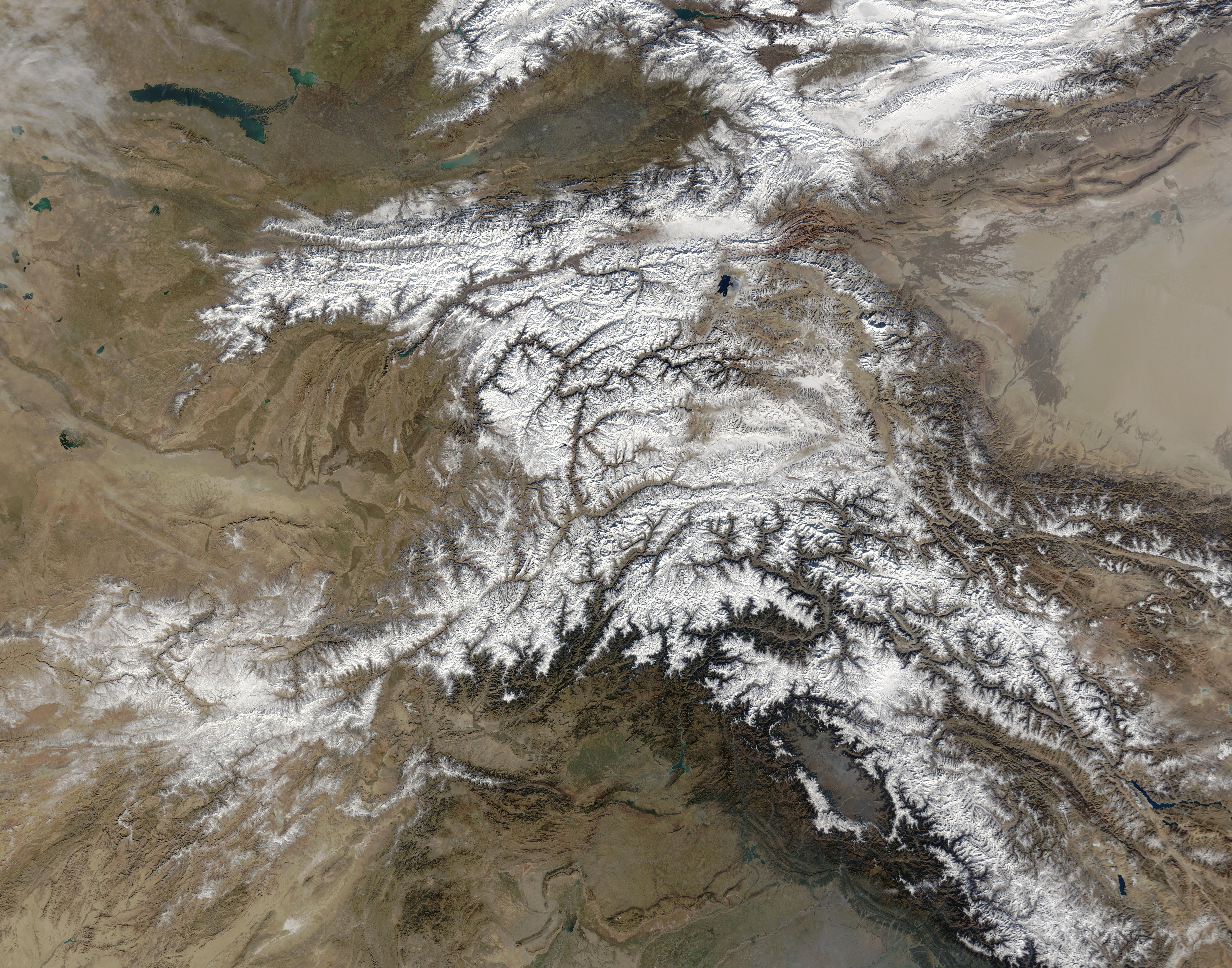 In this true-color Terra Moderate Resolution Imaging Spectroradiometer (MODIS) image, the Hindu Kush occupies the lower-left-center of the image. To the left are the relatively lower altitude plains of southern Kazakhstan, Uzbekistan, Turkmenistan, Afghanistan, and Pakistan. The fertile plains surrounding the northern strands of the Indus River are a deep green at the bottom center of the image (a translucent veil of smog adds a gray tinge to the region). Straddling the mountains north of the Kush are Kyrgyzstan and Tajikistan, which butt up against the arid Tarim basin of northwestern China. The Silk Road, the all-important trade route between China and Europe, runs through the Hindu Kush and this basin. This true-color Terra MODIS image was acquired on November 28, 2003.