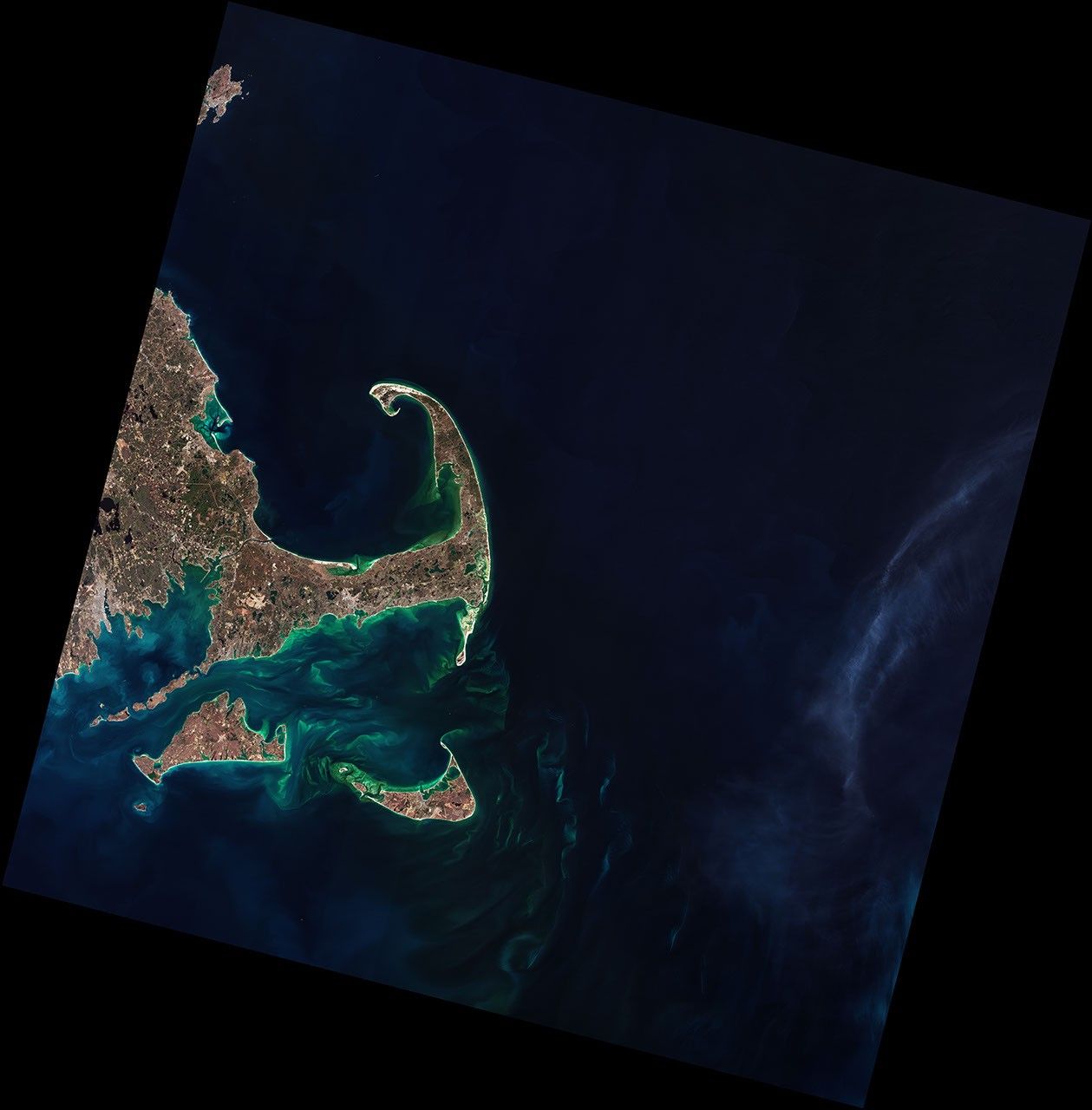 The image below—a closeup of Cape Cod, Martha’s Vineyard, Nantucket, and the shoals between them—was acquired by the Operational Land Imager (OLI) on the Landsat 8 satellite on February 24, 2020.