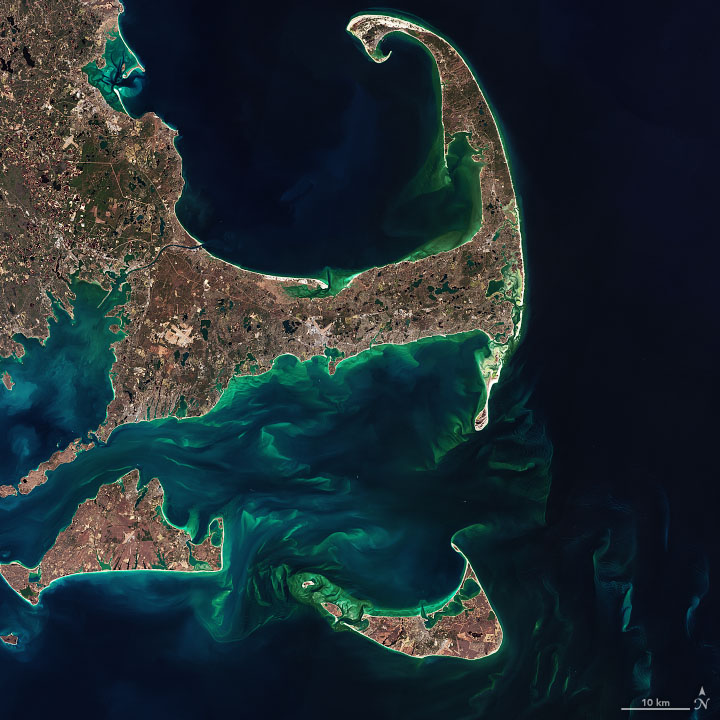 The image below—a closeup of Cape Cod, Martha’s Vineyard, Nantucket, and the shoals between them—was acquired by the Operational Land Imager (OLI) on the Landsat 8 satellite on February 24, 2020.