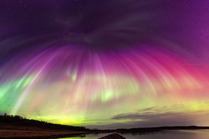 Ten years later, the Sun’s activity has been ramping up again, around the middle of the ongoing solar cycle 25. Photos acquired on May 10–11 show aurora associated with what NOAA called the most extreme geomagnetic storm since 2003. The image above, shot by Aurorasaurus ambassador Gunjan Sinha, shows the sky on May 11, looking south from near Saskatoon in Saskatchewan, Canada.