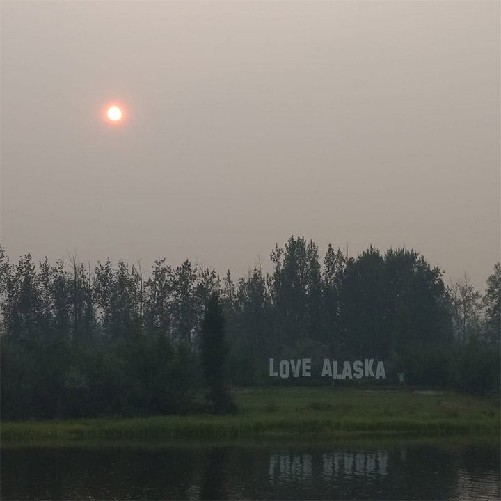The Moderate Resolution Imaging Spectroradiometer (MODIS) on NASA’s Aqua satellite captured an image of thick wildfire smoke swirling over the state on July 8, 2019. Meteorologists in Fairbanks reported visibility had dropped to less than one mile due to smoke, and air quality sensors in the city reported skyrocketing levels of particulates in the air. The photograph below, taken by a researcher from the Toolik Field Station, shows smoke obscuring the Sun along the Chena River in Fairbanks.
