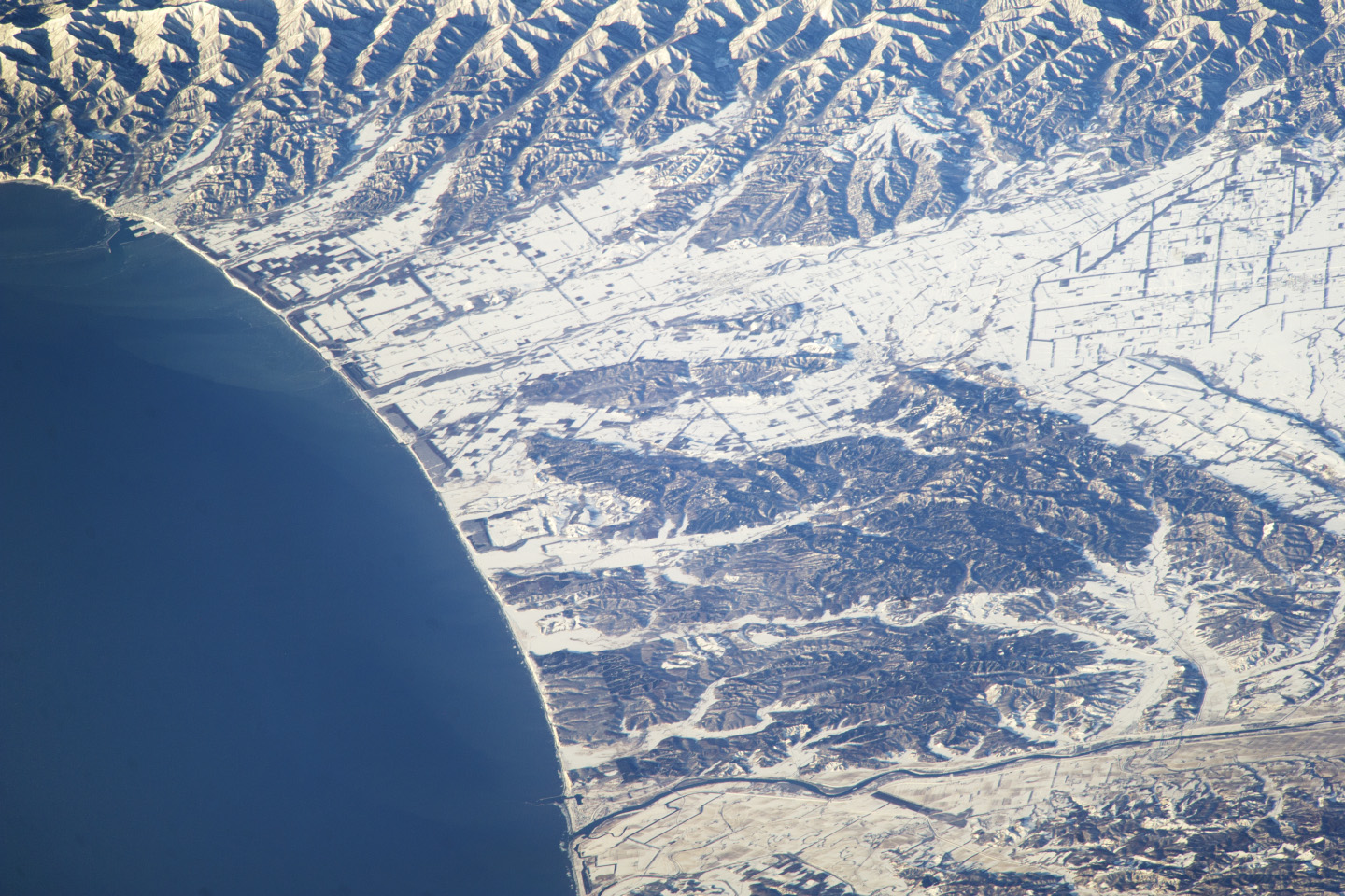 Unusually heavy snow fell on northern Japan this winter, and it helped highlight the flat, fenced landscape used for agriculture. In this photograph taken from the International Space Station, the Tokachi River reaches the arc of the Pacific Ocean on Hokkaido’s east coast. Forests on steeper hillsides mask the snow and appear dark.