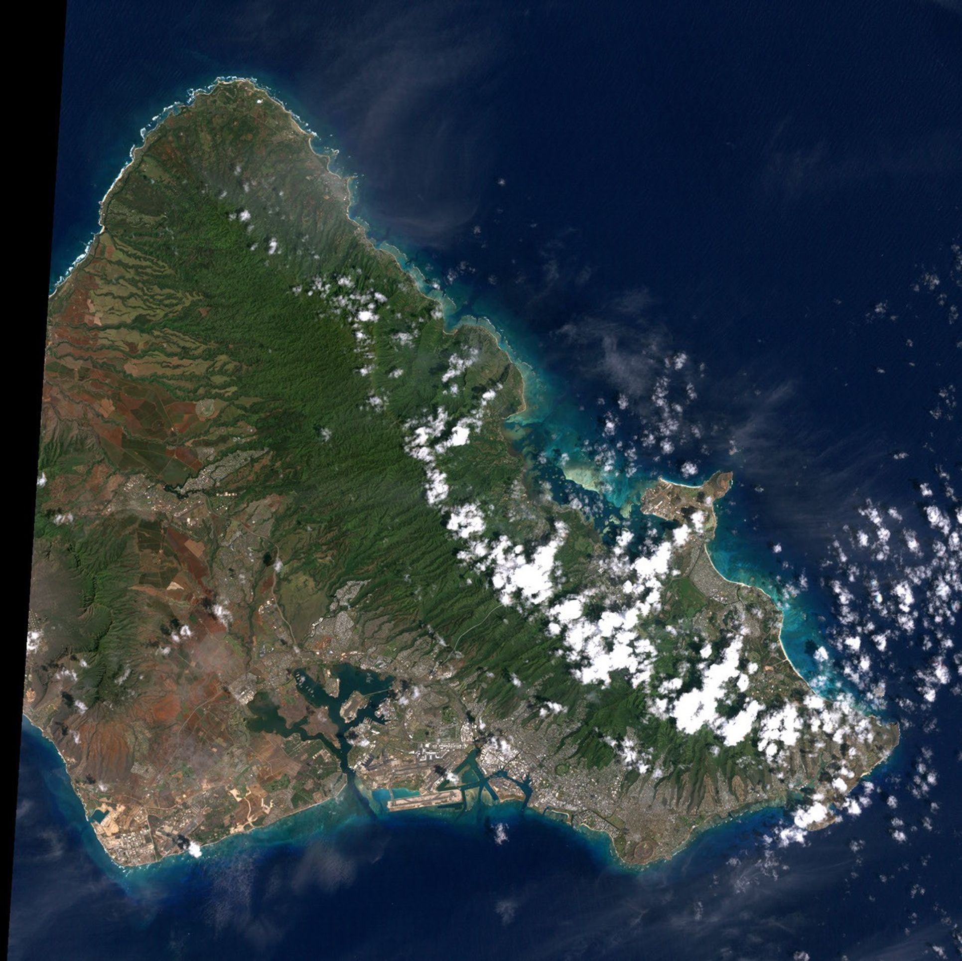 Honolulu is one of the most exotic resort destinations inthe United States. Honolulu is located on Oahu, the most populated of the Hawaiian Islands. Just to the East of Honoluluis Waikiki Beach, with throngs of tourists and dozens of high-risehotels. Overlooking Waikiki is Diamond Head, a volcanic crater formedfrom 70,000 to 500,000 years ago, long after Oahu’s principle volcanoes—Ko'olau and Wai'anae—stopped erupting. North ofDiamond Head are the eroded remains of Ko'olau. The clouds in the upper right hand corner of this image are an almost permanent feature of Oahu. Trade winds blowing from the northeast are stopped by the 3,000 foot (960 meter) high mountain range, where they rain out most of their moisture. As a result, the windward side of Oahu is usually cloudy, and the leeward side is relatively clear and dry. On the lefthand side of the image is Pearl Harbor, site of the Japanese air raid which drew America into World War II. The harbor still serves as a U.S. Navy base.