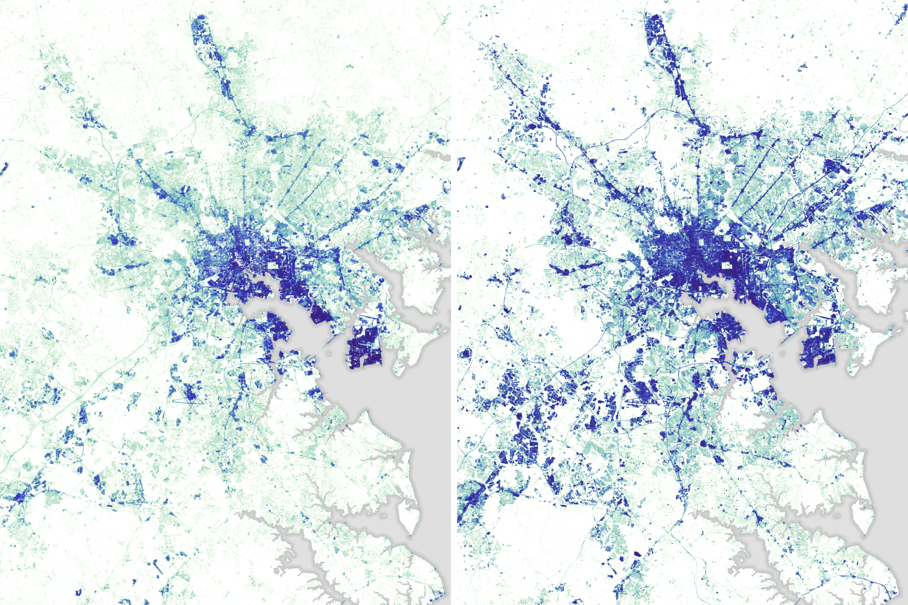 The maps above, based on Landsat data compiled by University of Maryland researchers, highlight the increase in impervious area in the Greater Baltimore Area. The map on the left shows impervious surfaces in 1984; the map on the right shows them in 2010. Note the widespread expansion both within the city center and the surrounding areas.