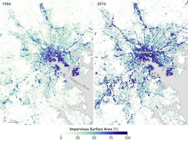 NASA Earth Observatory images by Joshua Stevens and Jesse Allen, based on Landsat data from the U.S. Geological Survey and a paper by Song et al. (2015) . Sparrows Point photograph courtesy of The Center for Land Use Interpretation . Bioretention photograph courtesy of Community & Environmental Defense Services . Caption by Adam Voiland.