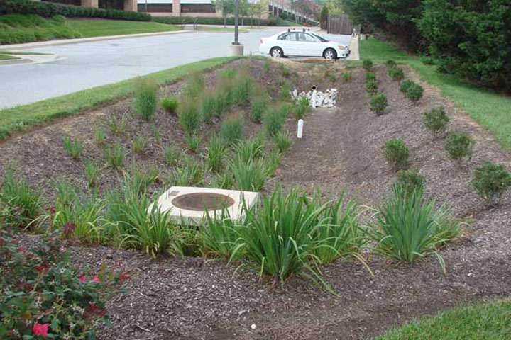 There are ways to counter stormwater runoff in cities and suburbs. The most effective approaches are to limit development of new impervious surfaces, preserve forested landscapes, enhance the permeability of urban soils, and expand green spaces in cities. Beyond that, the use of infiltration strips, sand filters, rain gardens, green roofs, and other infrastructure can help. The photograph above shows bio-retention infrastructure in Hunt Valley, Maryland. This type of infrastructure helps slow the flow of stormwater and filters out some pollutants before they reach the Bay.