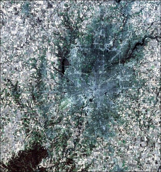 The photograph shows a coherent corridor of anthropogenic haze (arrows), probably a mixture of industrial air pollution, dust, and smoke, in the left half of the view against the dark background of the East China Sea (Wilkinson et al. 2000). The corridor is ~200 km wide and probably much more than 600 km long (the visible length over the sea). In this southwest-looking view, the island of Taiwan appears top left and the east coast of China across the rest of the view. The picture was taken as the Space Shuttle flew over Okinawa. Shanghai lies at the near point on the Chinese coastline (top right)—about 650 km away. The transport of smog from East Asia has been confirmed in measurements of the atmosphere over North America.