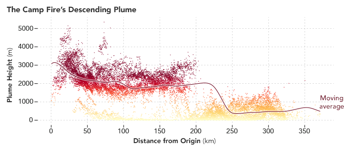 As the Camp Fire raged in Northern California on November 9, 2018, the Terra satellite passed over and gathered a wide range of data about the smoke plume. As its Moderate Resolution Imaging Spectroradiometer (MODIS) sensor showed a large cloud of smoke drifting from the fire (left top image), MISR’s cameras showed that the plume rose 2 to 3 kilometers in altitude (right top image) over some areas, enough to loft smoke into the free troposphere, where it can spread widely. The plume then descended to about 1 kilometer as it moved south and west and approached the ocean. The chart below shows the height of various smoke features measured by MISR at different distances from the source of the fire.