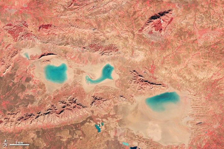 Red light (620 to 780 nanometers) can help distinguish minerals and soils that contain a high concentration of iron or iron oxides, making it valuable for studying geology. In the above image, for example, the exposed ground around Lake Issyk Kul varies in tone from pale tan to orange based on the mineral content of the soil. Since chlorophyll absorbs red light, this band is commonly used to monitor the growth and health of trees, grasses, shrubs, and crops. Red light can also help distinguish between different types of plants on a broad scale.