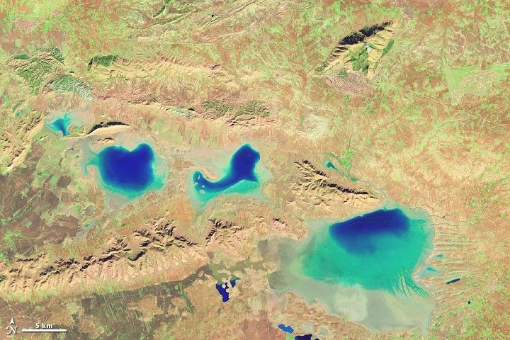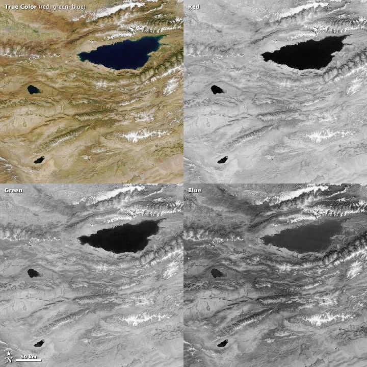 Combining red, green, and blue bands results in a true-color satellite image, such as this view of Lake Issyk Kul, Kyrgyzstan. (MODIS image from NASA Worldview.)