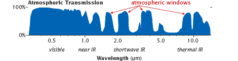 Atmospheric windows are regions of the spectrum where most light penetrates through the atmosphere, allowing satellites to view the Earth’s surface. (Figure adapted from Casey et al, 2012.)